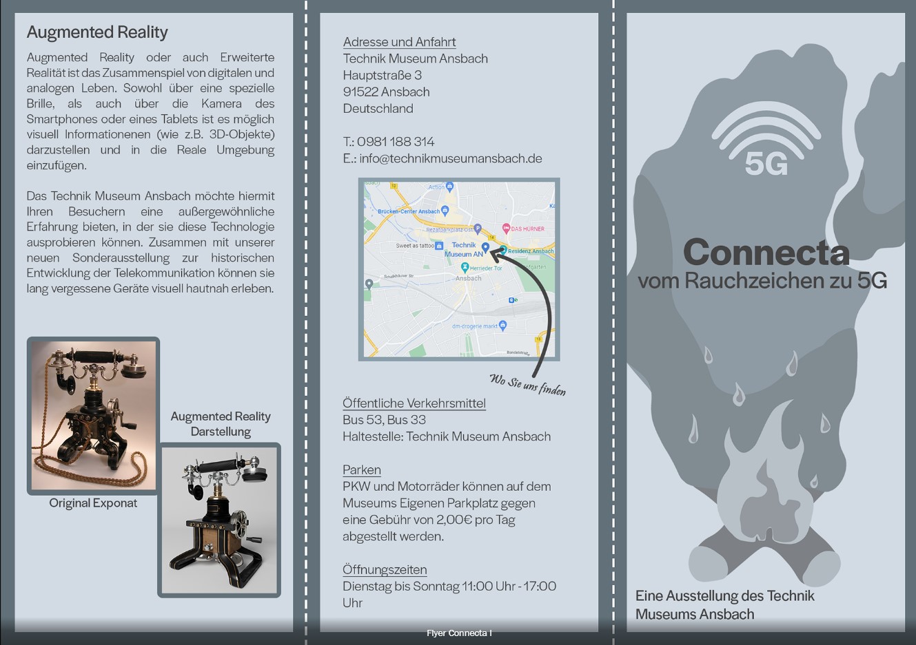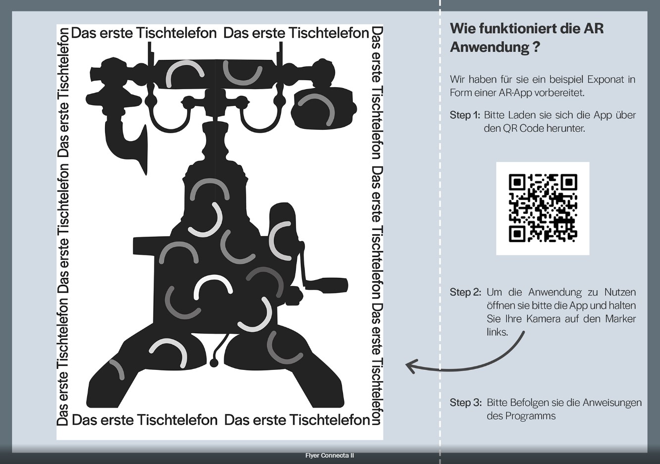 In diesem Augmented-Reality-Projekt wurde ein historisches Tischtelefon als interaktives 3D Modell digital zum Leben erweckt. Über einen gestalteten AR-Marker lässt sich das Modell in Unity betrachten und durch ein UI-Element animieren. Ziel war es, das Gerät möglichst originalgetreu zu rekonstruieren und mithilfe von AR-Technologie als digitales Ausstellungsstück für ein fiktives Museum namens Connecta umzusetzen. Ergänzt wurde das Projekt durch einen informativen, sechseitigen Flyer sowie passende Audioinhalte, die den historischen Kontext und die Funktionsweise des Telefons anschaulich vermitteln.