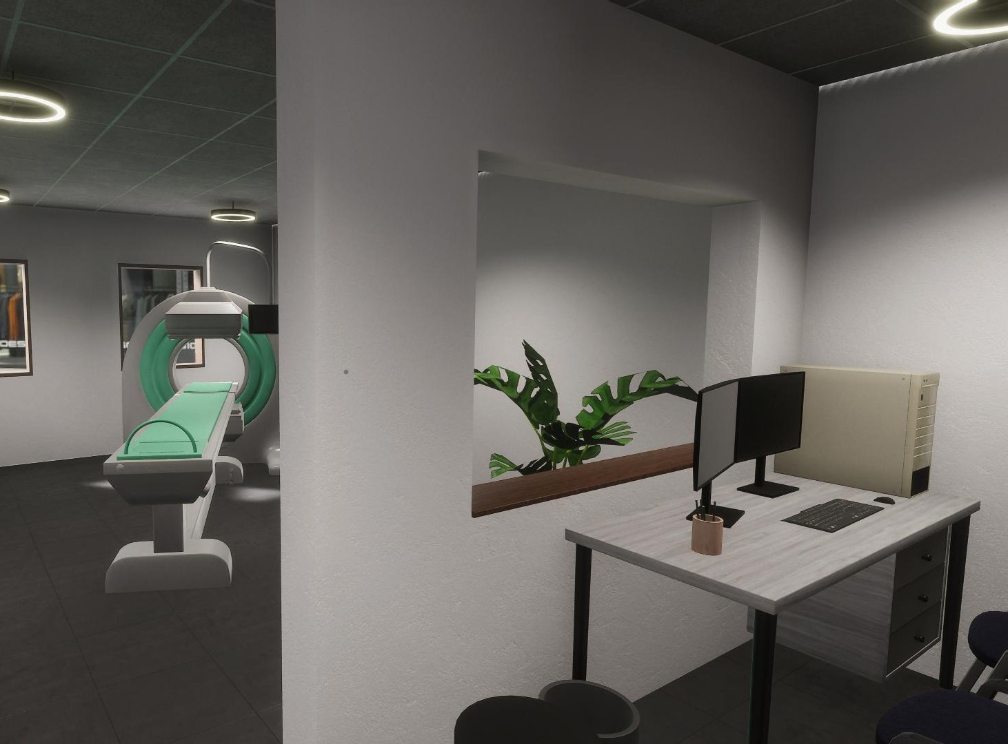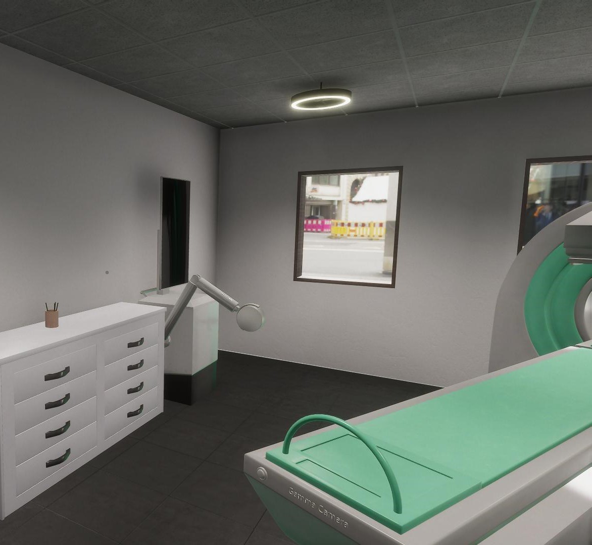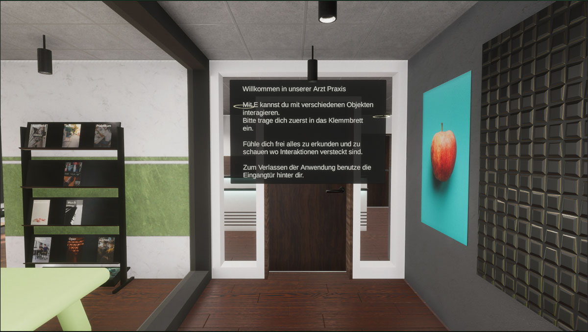 Die Simulation ermöglicht es den NutzerInnen, sich innerhalb der virtuellen Arztpraxis zu bewegen und mit verschiedenen Elementen zu interagieren. Ein besonderer Schwerpunkt lag auf der Implementierung der HDRP von Unity. Wir nutzten die HDRP, um realistische visuelle Effekte und hochwertige Grafiken in der virtuellen Umgebung darzustellen.