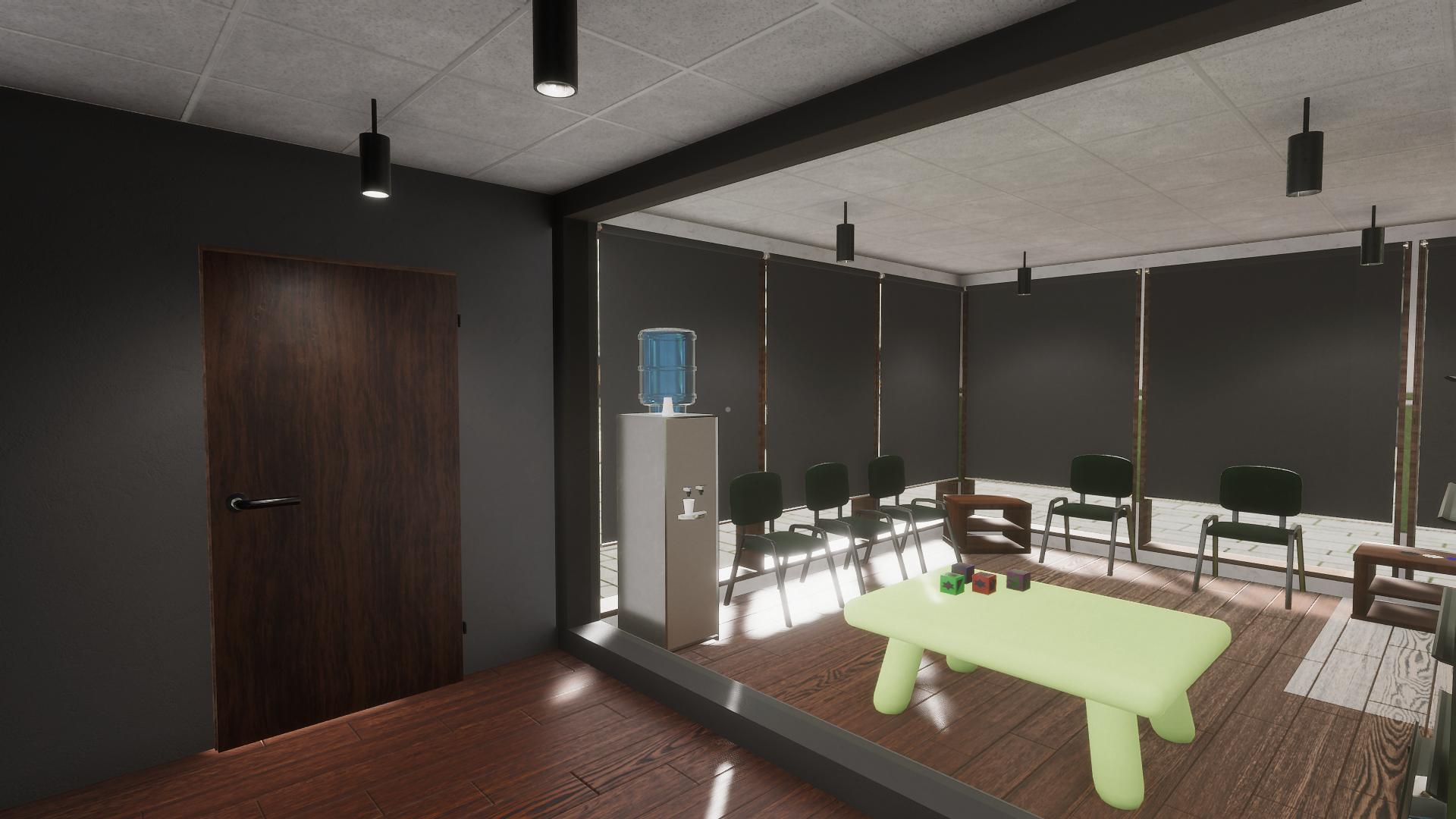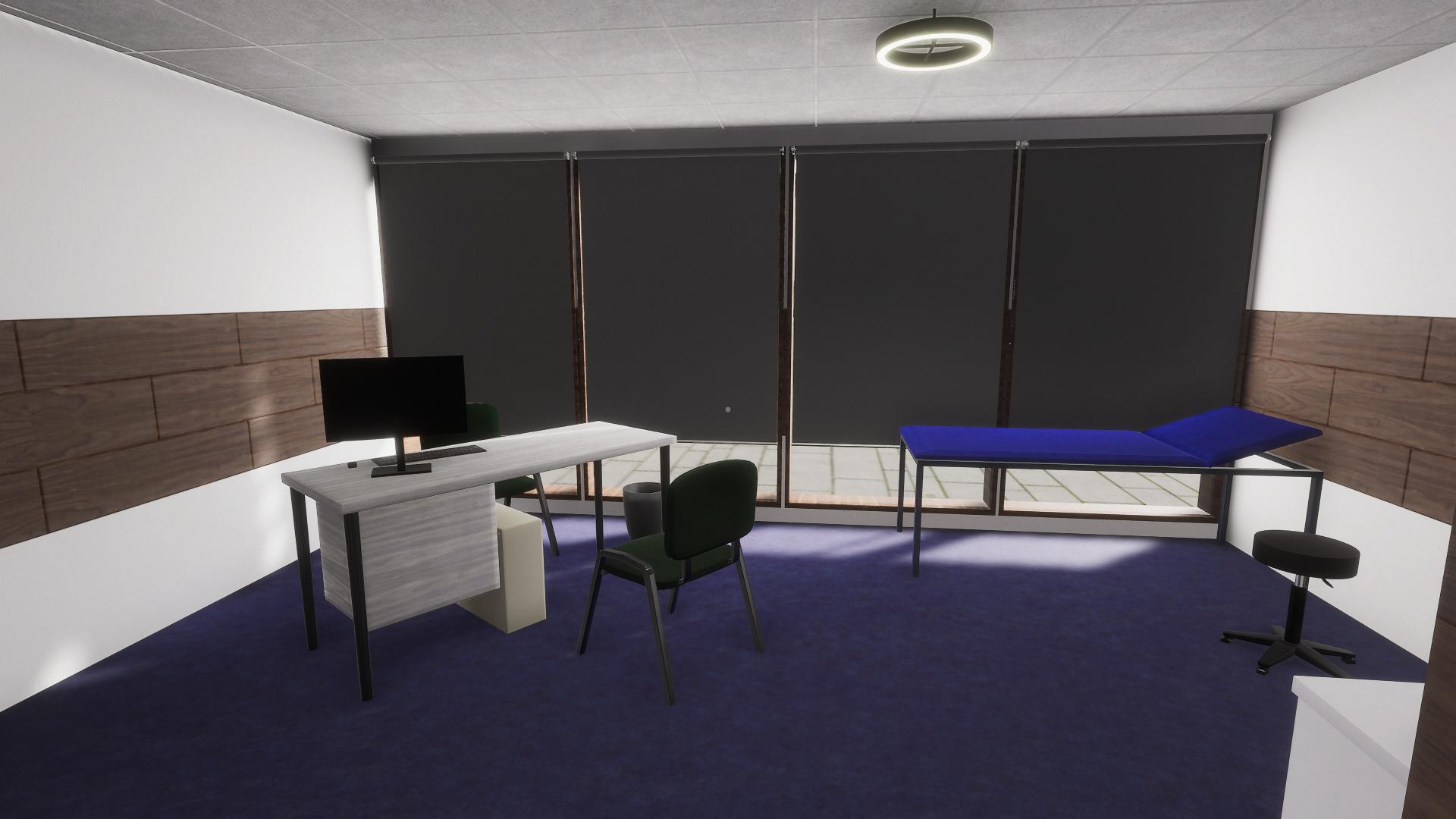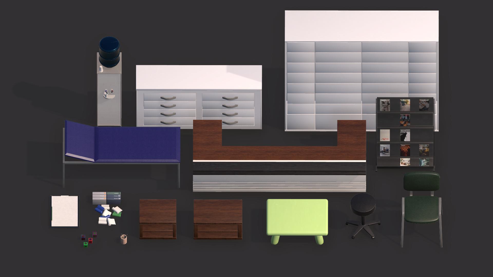 Für dieses Projekt habe ich einen Teil der Assets vorbereitet, UV-Unwrapped und mit Texturen via Quixel Mixer versehen. Ein paar Assets wie die Tür, die Schubladen und das Spielzeug im Warteraum habe ich zusätzlich Animationen in Unity erstellt.